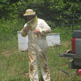 开车40多分钟去看采蜜。 我们都躲在车里看。采蜜者要穿上厚厚的保护服,戴上面罩。 先要用烟把蜜蜂熏出来,然后把蜜蜂住的'房子'搬起来,用吹气机把藏在里面的蜜蜂吹走。每个房子有10个隔板,拿起每个板就能看到蜜蜂的蜂巢。蜂蜜就藏在里面。取蜜的时候要先用热好的电刀刮掉蜂巢表面的硬壳,再把几个蜂巢板放在一个大的离心机里,离心机转起来,就把蜂蜜甩出来了。后面的工程就是过滤,装瓶。。